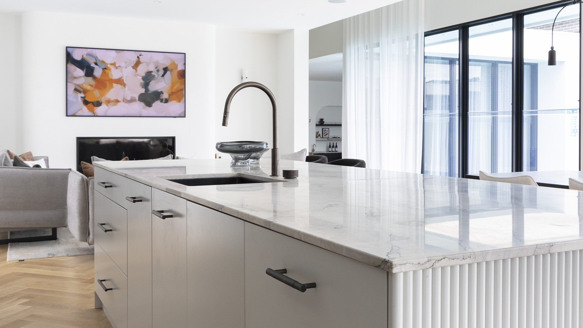 Blending luxury with practicality, the home’s carefully curated interiors feature dark accents, quality finishes, and a mix of metals that harmonise beautifully with the architectural elements. From the knurled textures in the kitchen to bespoke lighting and artful décor, every detail reflects a celebration of thoughtful design, resulting in a space that feels both timeless and inviting.