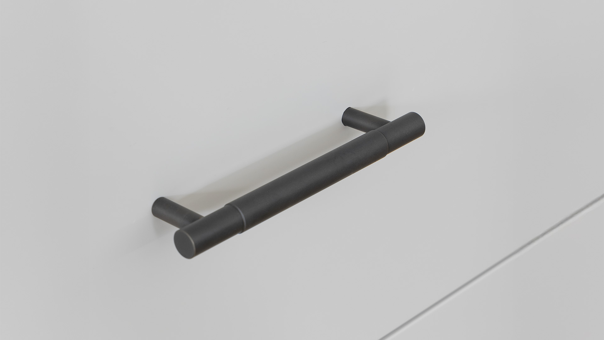 The cabinet handles were chosen in a living Dark Roman Brass finish to complement the dark joinery, tying the accents together while subtly enhancing the kitchen’s design without overpowering it.