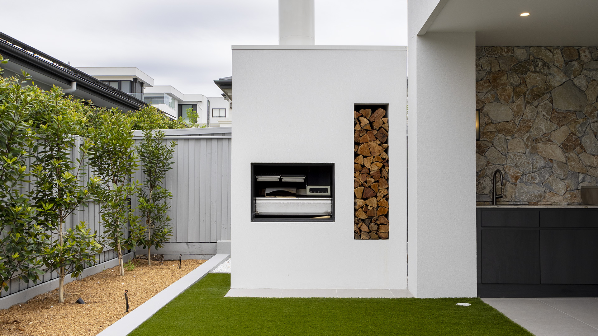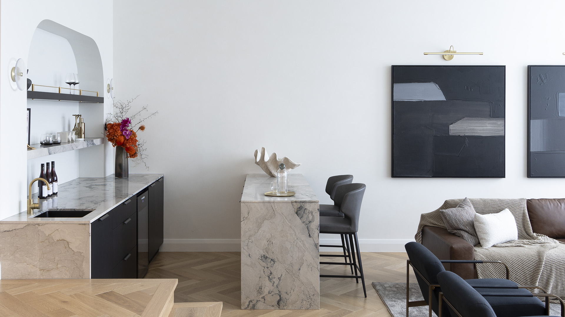Space The kitchen is a top contender with the unique stone that features dark accents tying in with other joinery used throughout the home. Décor Item The lighting features throughout the home from Light Co and Soktas also the vessels from The Foundry.