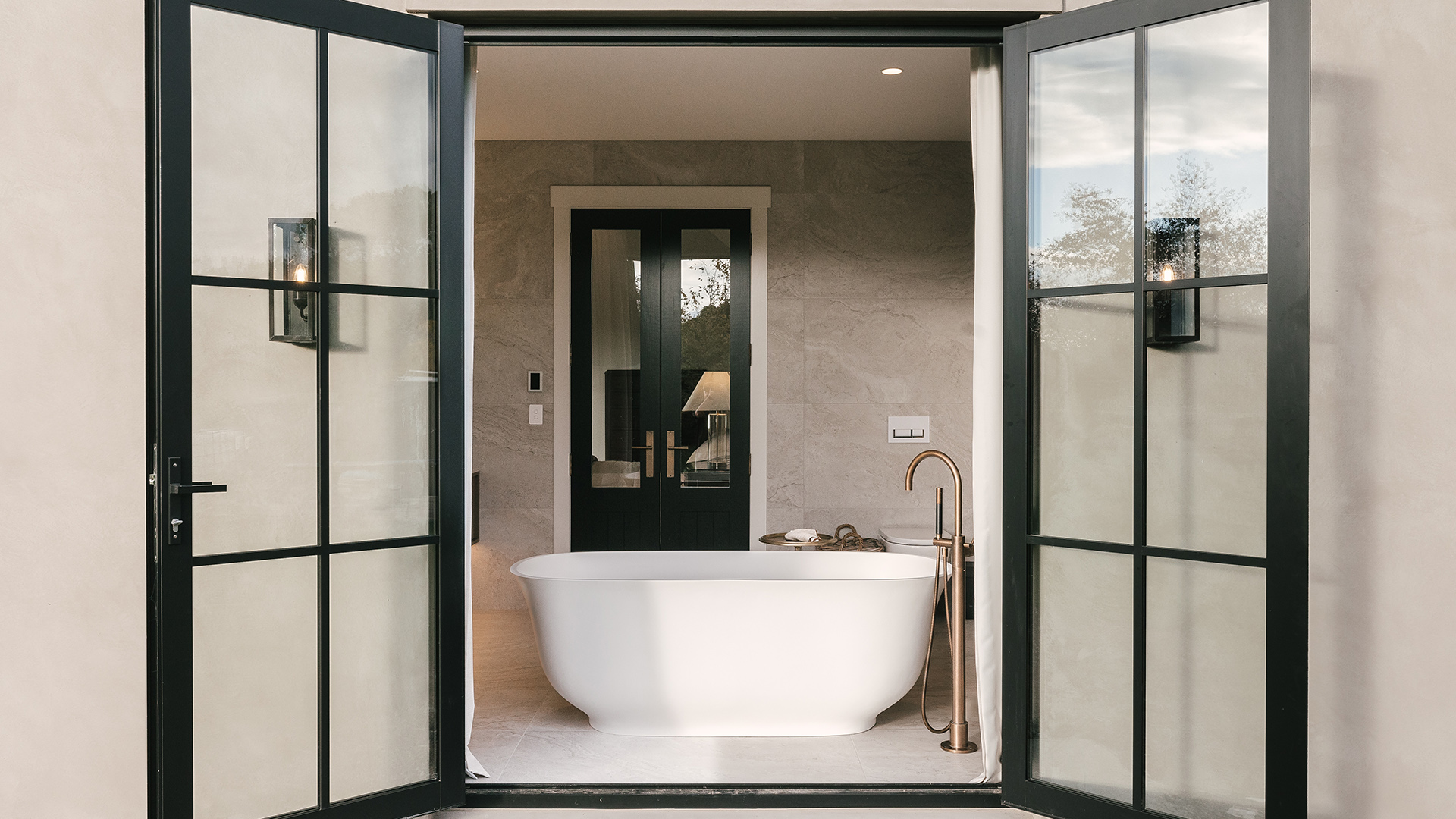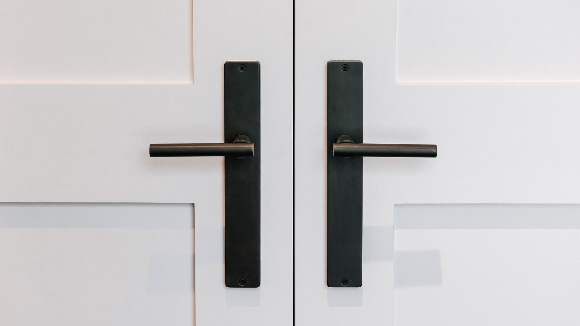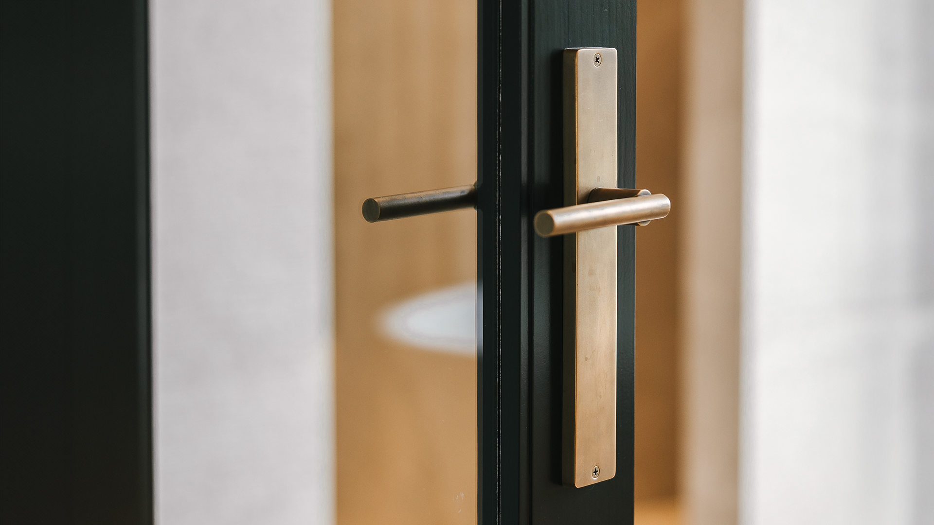 They chose the longplate for their doors to make a statement, opting for Dark Roman Brass and Roman Brass finishes that complement the natural materials used throughout their home, such as dark matt oak flooring, aged brass tapware, steel feature doors, an oak kitchen, and wool carpeting.